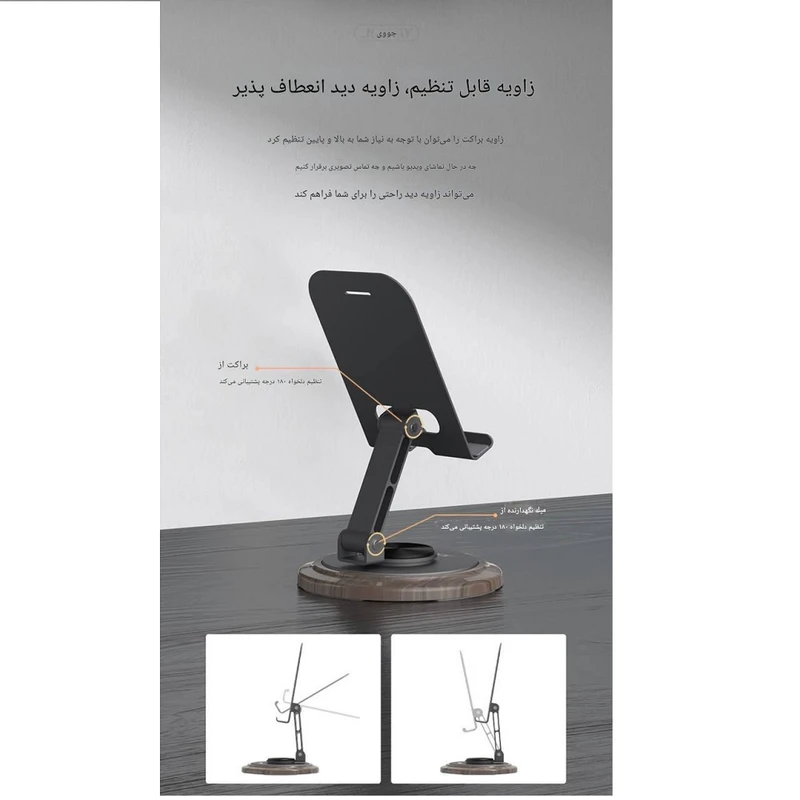 این هلدر رومیزی با طراحی مدرن و پایهای با طرح چوب، انتخابی کاربردی و زیبا برای استفاده روزمره است. بدنه آن از فلز آلومینیوم مقاوم ساخته شده و از قابلیت تنظیم زاویه و چرخش ۳۶۰ درجه پشتیبانی میکند. همچنین امکان تاشدن دارد و حمل و جابهجایی آن را آسان میسازد. برای محافظت بهتر از دستگاه، در بخش پایه و کف هلدر سیلیکون ضدلغزش بهکار رفته که مانع خطخوردگی و لیز خوردن میشود. این هلدر قابلیت انعطافپذیری تا زاویه ۱۸۰ درجه را نیز دارد و استفاده از آن را در شرایط مختلف بسیار راحت …